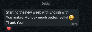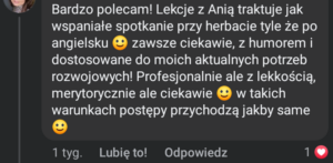 • poniedziałek godz. 18.30 zajęcia 60min (angielski ogólny, poziom B2)